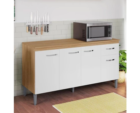 Está procurando móveis para sua cozinha? Apresentamos para você este belo balcão da linha Gabriela. Seu design funcional inclui tampo, quatro portas e uma gaveta equipada com corrediças metálicas, oferecendo um ótimo espaço interno para acomodar seus utensílios ou mantimentos. Os puxadores e pés em PVC completam o visual moderno, proporcionando mais estabilidade e resistência. Fabricado pela AJL, é desenvolvido em 100% MDP. Com 150cm de largura, combina qualidade e excelente acabamento, sendo uma escolha ideal para quem busca praticidade e organização para compor sua cozinha. Aproveite e garanta já o seu!