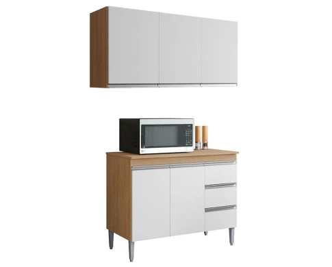Balcão de Cozinha com Tampo 100cm e Armário Aéreo 3 Portas Andréia Amêndoa Branco - AJL