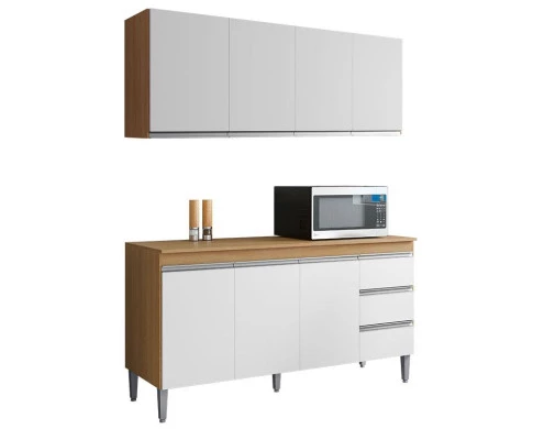Começou a montar sua cozinha? Então apresentamos para você este belo conjunto da linha Andréia. O balcão conta com tampo incluso, três portas e três gavetas equipadas com corrediças metálicas garantindo maior durabilidade e um deslizamento suave. Os puxadores embutidos oferecem um visual mais moderno e clean, enquanto os pés em PVC proporcionam mais estabilidade e resistência. Complementando o conjunto, o armário possui quatro portas, assim como o balcão, conta com puxadores em PVC e uma prateleira, ideal para manter seus utensílios organizados e de fácil acesso. Desenvolvidos em 100% MDP de qualidade, são fabricados pela AJL e projetados cuidadosamente para otimizar o espaço da cozinha com mais elegância e funcionalidade. Aproveite e garanta já o seu!