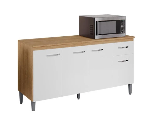 Está procurando móveis para sua cozinha? Apresentamos para você este belo balcão da linha Gabriela. Seu design funcional inclui tampo, quatro portas e uma gaveta equipada com corrediças metálicas, oferecendo um ótimo espaço interno para acomodar seus utensílios ou mantimentos. Os puxadores e pés em PVC completam o visual moderno, proporcionando mais estabilidade e resistência. Fabricado pela AJL, é desenvolvido em 100% MDP. Com 150cm de largura, combina qualidade e excelente acabamento, sendo uma escolha ideal para quem busca praticidade e organização para compor sua cozinha. Aproveite e garanta já o seu!