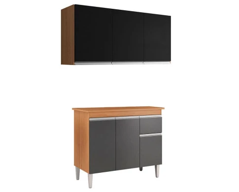 Balcão de Cozinha Tatiane com Tampo 100cm e Armário Aéreo Andréia 3 Portas Amêndoa Preto - AJL