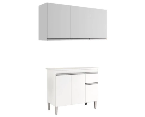 Balcão de Cozinha Tatiane com Tampo 100cm e Armário Aéreo Andréia 3 Portas Branco Brilho - AJL