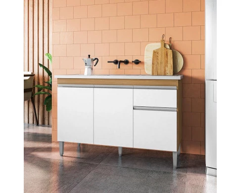 Começou a montar sua cozinha? Então apresentamos para você este belo balcão da linha Tatiane. Oferecendo um ótimo espaço interno com três portas e uma gaveta equipado com corrediças metálicas, garantindo uma abertura suave e boa durabilidade. Os puxadores embutidos proporcionam um visual mais clean e sofisticado, enquanto seus pés em PVC oferecem mais estabilidade e facilita na hora da limpeza. Fabricado pela AJL, é desenvolvido em 100% MDP sendo resistente e com acabamento elegante. Com 120cm de largura é a escolha perfeita para quem busca compor a cozinha com praticidade, estilo e eficiência. Aproveite e garanta já o seu!