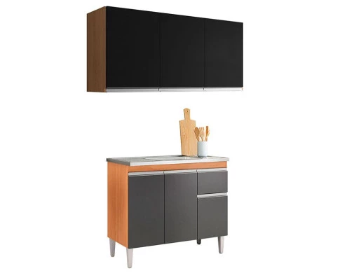 Balcão de Pia Tatiane 100cm e Armário Aéreo Andréia 3 Portas Amêndoa Preto - AJL