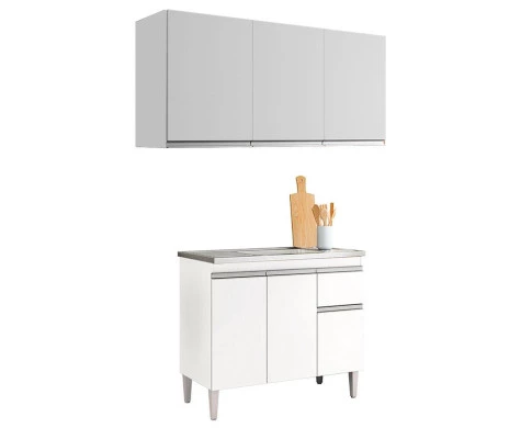 Balcão de Pia Tatiane 100cm e Armário Aéreo Andréia 3 Portas Branco Brilho - AJL