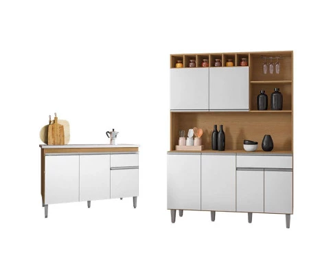 Começou a procurar móveis para sua cozinha? Então apresentamos para você este belo conjunto composto belo balcão da linha Tatiane e Kit para cozinha da linha Alice. O balcão possui três portas e uma gaveta. Com puxadores embutidos proporciona um acabamento elegante. Completando o conjunto, o kit para cozinha conta com seis portas, uma gaveta, nicho com seis repartições pequenas e três nichos, sendo dois menores e um grande. Assim como o balcão, possuem puxadores e pés em PVC e corrediças metálicas. Fabricados pela AJL, são desenvolvidos em 100% MDP, resistentes e com design compacto, é ideal para otimizar sua cozinha sem abrir mão da durabilidade. Aproveite e garanta já o seu!