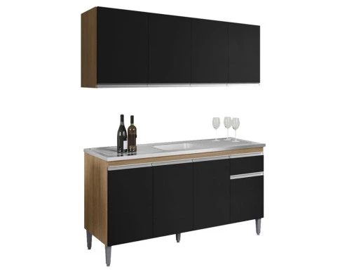 Balcão de Pia Tatiane 145 cm e Armário Aéreo Andreia 150 cm 4 Portas Amêndoa Preto – AJL
