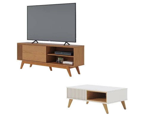 Apresentamos este conjunto de Rack Bancada Otawa e Mesa de Centro Jeri, fabricados pela Colibri. O rack possui tampo com detalhe chanfrado, detalhe frontal em ripado artesanal, 01 porta deslizante, pés em madeira maciça e suporta TV de ate 65 polegadas. A mesa com seu design contemporâneo e simétrico possui dois nichos internos e pés em madeira maciça dando estabilidade e um toque sofisticado. Fabricados com materiais de alta qualidade que garante resistência e durabilidade aos produtos. Confira mais detalhes e aproveite!