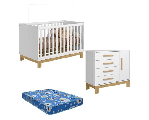 Berço Americano 4315 e Cômoda Sapateira 4355 Q Encanto Slim Branco Acetinado com Colchão Tend Tudo – Qmovi