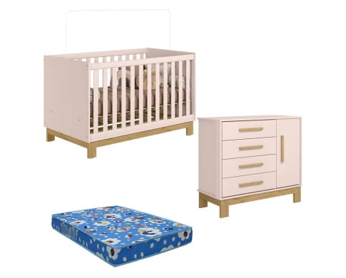 Berço Americano 4315 e Cômoda Sapateira 4355 Q Encanto Slim Rosa Acetinado com Colchão Tend Tudo – Qmovi