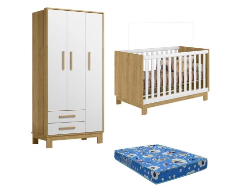 Berço Americano 4315 e Guarda Roupa 4340 Q Encanto Slim Freijó TOQ Branco Acetinado com Colchão Tend Tudo– Qmovi