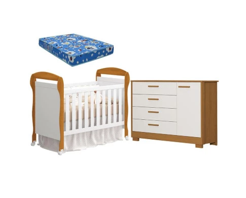 Berço Americano Danny e Cômoda Infantil Zaki Branco Acetinado Savana com Colchão Ortobom - Reller