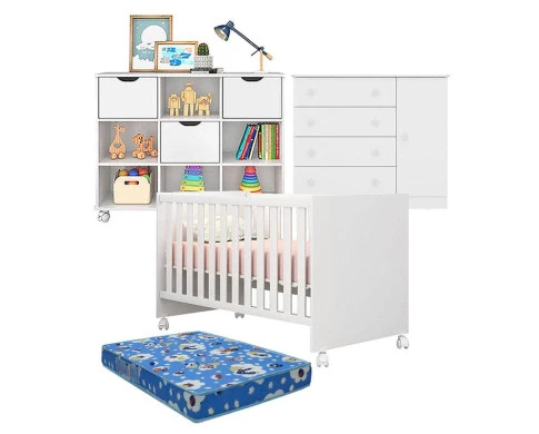 Chegou a hora de comprar os móveis para o quarto do seu bebê, então você veio ao lugar certo! Apresentamos mais uma linda combinação do Berço 100 com Colchão e Cômoda 2561 com o Nicho organizador com 3 gavetas. Estes lindos produtos são fabricados pela Qmovi com lindo design para trazer muita modernidade e sofisticação ao quartinho. Aproveite!