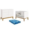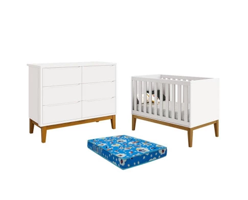 Berço Americano e Cômoda 6 Gavetas New Classic Branco com Pés Madeira e Colchão Ortobom – Reller