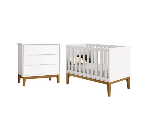 Berço Americano e Cômoda Gaveteiro New Classic Branco com Pés Madeira – Reller