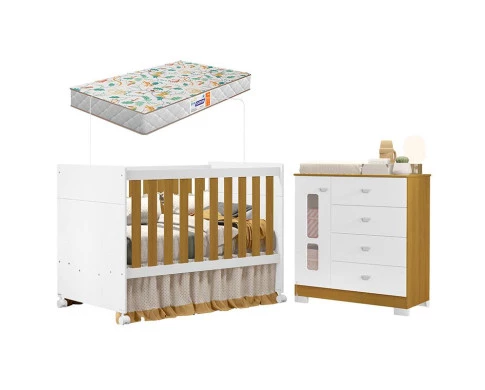Berço Americano e Cômoda Infantil Katatau Branco Acetinado Savana com Colchão Gazin– Reller