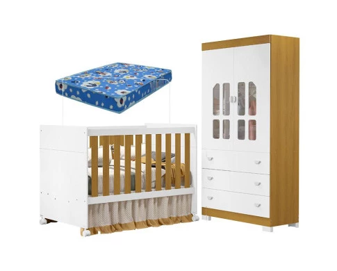 Berço Americano e Cômoda Infantil Katatau Branco Acetinado Savana com Colchão Ortobom– Reller