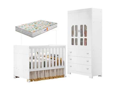 Berço Americano e Guarda Roupa Infantil Katatau Branco Acetinado com Colchão Gazin – Reller
