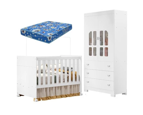 Berço Americano e Guarda Roupa Infantil Katatau Branco Acetinado com Colchão Ortobom – Reller