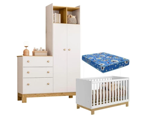 Berço Americano 4315 Mini Cama e Guarda Roupa com Cômoda Q Encanto Slim 4970 Branco Acetinado com Colchão Tend Tudo – Qmovi