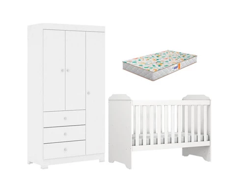 A mamãe começou a procurar os móveis para o quartinho do seu filho? Apresentamos para você este belo conjunto composto pelo berço americano acompanhado do colchão Gazin da linha Mel desenvolvido pela Carolina e o guarda roupa 3 portas da linha Duda desenvolvidos pela Phoenix Baby. O berço vem com a opção de ser utilizado como mini cama, prolongando a sua vida útil. Completando o conjunto, o guarda roupa possui três portas e três gavetas, entregando toda comodidade para a mamãe guardar as roupinhas e acessórios. São fabricados em MDP/ MDF de qualidade, garantindo mais durabilidade e resistência. Esse conjunto será perfeito para quem deseja móveis que dure todas as fases de crescimento do seu bebê. Confira as características: