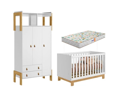 Berço Americano 4315 Mini Cama Q Encanto Slim e Guarda Roupa Fantasia 4375 Branco Acetinado com Colchão Gazin – Qmovi