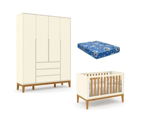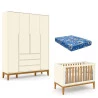 Berço Americano New Off White Freijó e Guarda Roupa Infantil 4 Portas Off White Eco Wood com Colchão para Berço Americano - Matic