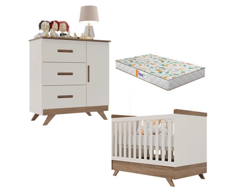 Berço Americano Vitória e Cômoda Retro Maya Off White Carvalho com Colchão Gazin – Carolina