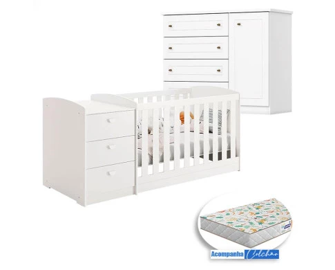 Na hora de decorar o quartinho do bebê escolha móveis que vão unir conforto e praticidade! Apresentamos o Berço Multifuncional Atlanta da Reller e a Cômoda Infantil Americano desenvolvido pela Henn. Berço padrão Americano, cômoda acoplada, gavetas com corrediças telescópicas e com 3 opções diferentes de montagem de mini cama podendo acompanhar o desenvolvimento da criança e utilizar por muito tempo, também acompanha o colchão Gazin no padrão americano 70x130. A cômoda conta com 4 gavetas, 1 porta com usinagem em baixo relevo, corrediças telescópicas e prateleiras internas. Confira mais detalhes abaixo e não deixe de adquirir produtos fabricados com a mais alta qualidade!