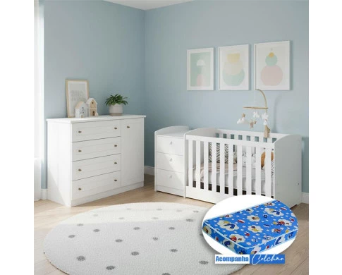 Berço Multifuncional Atlanta e Cômoda Infantil Mississpi Henn Branco Fosco com Colchão Ortobom - Reller
