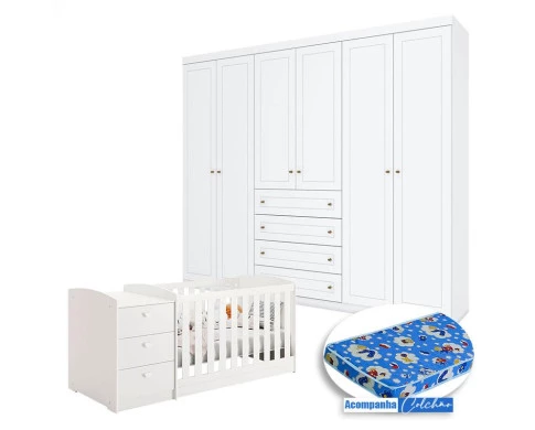 Berço Multifuncional Atlanta e Guarda Roupa 6 Portas Mississipi Branco Fosco Henn com Colchão Ortobom - Reller