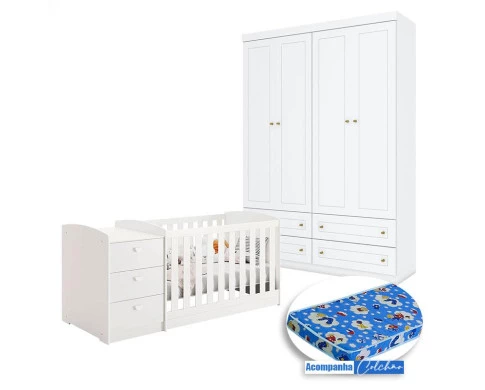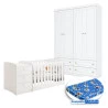 Berço Multifuncional Atlanta e Guarda Roupa Mississipi 4 Portas Henn Branco Fosco com Colchão Ortobom - Reller