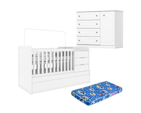 Berço Multifuncional Cleo e Cômoda Infantil Americano Branco Fosco com Colchão Ortobom - Henn