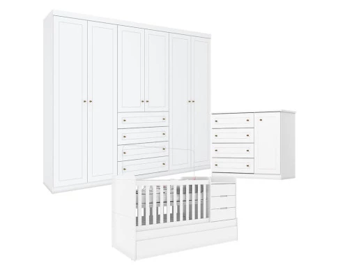 Berço Multifuncional Cleo e Guarda Roupa 6 Portas Americano Ambiente Branco Fosco - Henn