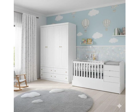 Berço Multifuncional Cleo e Guarda Roupa Infantil 4 Portas Mississipi Ambiente Branco Fosco - Carolina