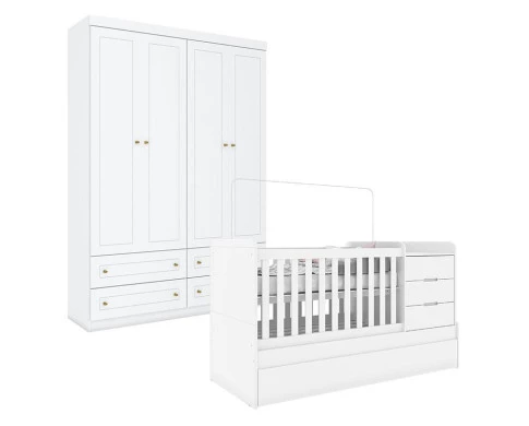 Berço Multifuncional Cleo e Guarda Roupa Infantil 4 Portas Mississipi Branco Fosco - Carolina