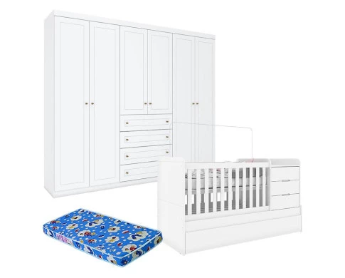Berço Multifuncional Cleo e Guarda Roupa Infantil 6 Portas Americano Branco Fosco com Colchão Ortobom - Henn