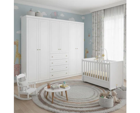 Decore o quarto do bebê com o que há de melhor em praticidade, design e o melhor preço do mercado! Apresentamos o Berço Americano Tutto New desenvolvido pela Matic e o Guarda Roupa Americano 6 Portas produzido pela Henn. Berço com padrão americano, estrado com 3 regulagens de altura, função mini cama que permite a utilização do móvel de acordo com o crescimento da criança. O Guarda Roupa possui amplo espaço, gavetas com corrediças telescópicas, prateleiras, frente com usinagem em baixo relevo e várias divisórias, perfeitas para auxiliar no seu dia a dia na hora da organização. Confira mais detalhes abaixo e não deixe de adquirir produtos fabricados com a mais alta qualidade!