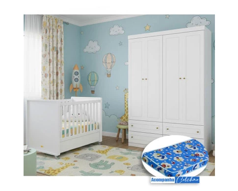 Berço Tutto New e Guarda Roupa Infantil Mississipi Ambiente 4 Portas Branco Fosco com Colchão Ortobom - Matic