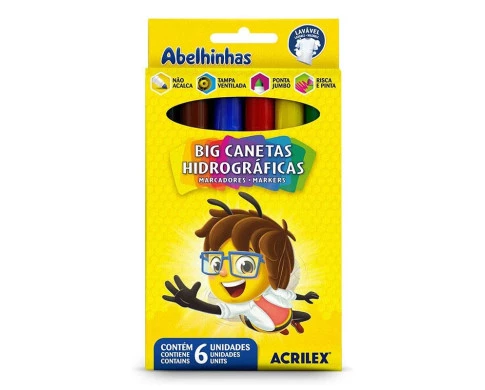 Com 6 cores vivas e intensas a Big Caneta Hidrográfica da Acrilex é perfeita para soltar a imaginação e deixar as obras de artes coloridas e incríveis, não perca mais tempo e aproveite!