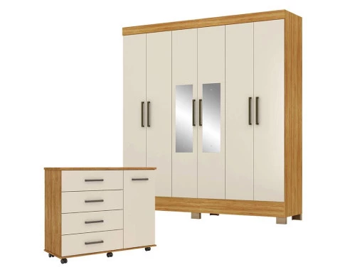 Cômoda Flora e Guarda Roupa Casal Prático Cinamon Touch Off White com Espelho – Demóbile
