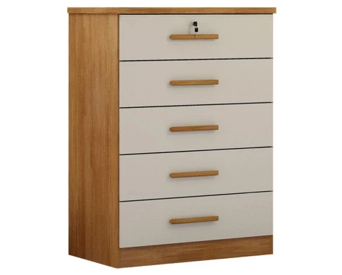 Esta precisando de uma cômoda? Apresentamos a linha Suiça, uma cômoda com 5 gavetas sendo uma delas equipada com chave para garantir mais segurança aos seus pertences. Fabricada em MDP/MDF garantindo qualidade e resistência. Seus puxadores amadeirados agregam charme e sofisticação, tornando-a uma peça versátil para complementar a decoração do seu quarto com estilo e praticidade. Venha aproveitar e garantir já o seu!