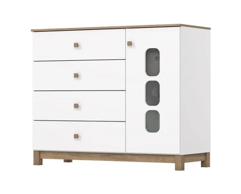 Organize o quarto do bebê com o que há de melhor em qualidade e preço justo! Apresentamos a Cômoda Infantil Aconchego, desenvolvida pela Henn. Frente em MDF, 4 gavetas espaçosas com corrediças telescópicas, uma porta com detalhe usinado e vidro, amplo espaço interno para armazenar roupas e objetos de maneira prática e funcional. Confira mais detalhes abaixo e aproveite esta oportunidade!
