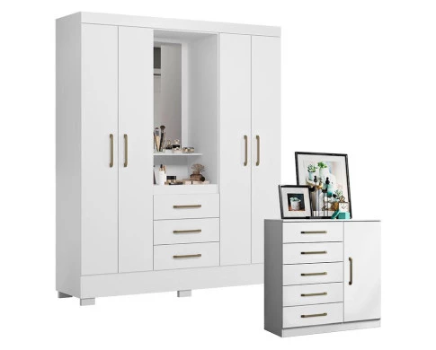Cômoda Milão e Guarda Roupa Solteiro Paris 2045150 Branco - Aramóveis