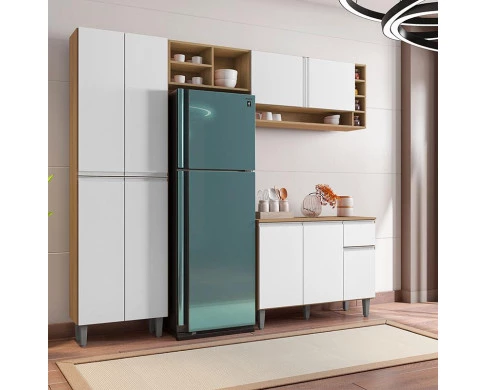 Está montando sua cozinha? Apresentamos para você este belo conjunto da linha Vanessa. Composto por uma paneleiro com quatro portas, um armário aéreo para geladeira com três nichos, um armário aéreo com duas portas, contando ainda com quatro pequenos nichos na lateral e um nicho maior inferior, perfeito para acomodar seus acessórios ou objetos decorativos. Complementando o conjunto, conta com um balcão com três portas e uma gaveta equipada com corrediças metálicas. Os puxadores e os pés em PVC entregam mais resistência e um visual moderno. Fabricado pela AJL, é desenvolvido em 100% MDP, sendo ideal para quem busca um ambiente organizado, bonito e funcional. Aproveite e garanta já o seu!