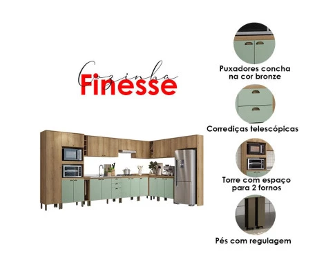 A cozinha modulada Finesse da THB Móveis é um conjunto de módulos de cozinha que permitem montar um ambiente completo e funcional com peças combináveis conforme seu espaço. Os módulos vêm em acabamento Capuccino com Menta, traçando um visual moderno, elegante e contemporâneo que combina com diversos estilos de decoração.