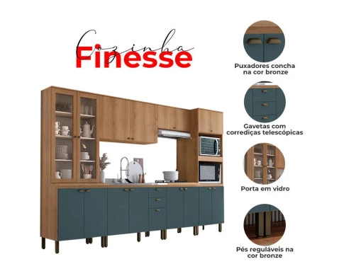 A cozinha modulada Finesse da THB Móveis é um conjunto de módulos de cozinha que permitem montar um ambiente completo e funcional com peças combináveis conforme seu espaço. Os módulos vêm em acabamento Capuccino com Azul, traçando um visual moderno, elegante e contemporâneo que combina com diversos estilos de decoração.