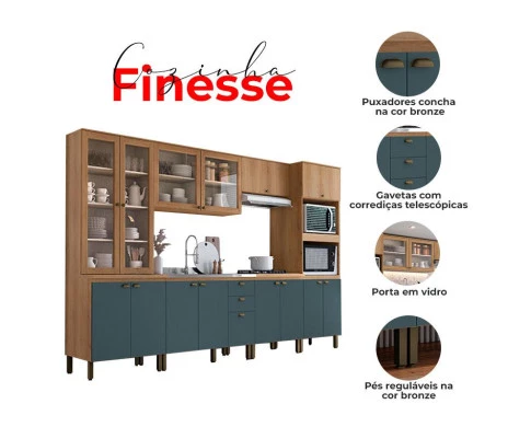 A cozinha modulada Finesse da THB Móveis é um conjunto de módulos de cozinha que permitem montar um ambiente completo e funcional com peças combináveis conforme seu espaço. Os módulos vêm em acabamento Capuccino com Azul, traçando um visual moderno, elegante e contemporâneo que combina com diversos estilos de decoração.