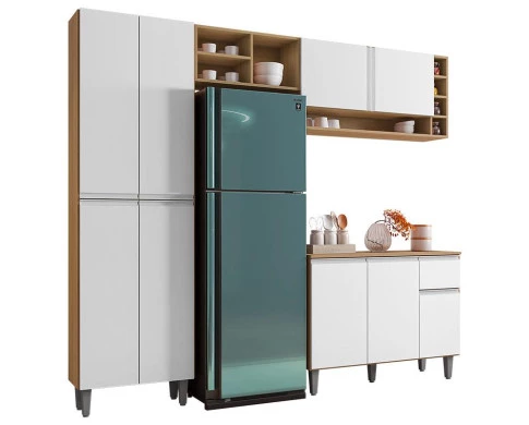 Está montando sua cozinha? Apresentamos para você este belo conjunto da linha Vanessa. Composto por uma paneleiro com quatro portas, um armário aéreo para geladeira com três nichos, um armário aéreo com duas portas, contando ainda com quatro pequenos nichos na lateral e um nicho maior inferior, perfeito para acomodar seus acessórios ou objetos decorativos. Complementando o conjunto, conta com um balcão com três portas e uma gaveta equipada com corrediças metálicas. Os puxadores e os pés em PVC entregam mais resistência e um visual moderno. Fabricado pela AJL, é desenvolvido em 100% MDP, sendo ideal para quem busca um ambiente organizado, bonito e funcional. Aproveite e garanta já o seu!