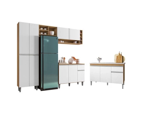 Está montando sua cozinha? Apresentamos para você este belo conjunto composto pela cozinha da linha Vanessa e o balcão da linha Tatiane. A cozinha conta com um paneleiro com quatro portas, aéreo geladeira com três nichos abertos, aéreo com duas portas, quatro nichos pequenos e um nicho maior inferior e balcão com tampo incluso. Completando o conjunto, o balcão com 120cm de largura, assim como a cozinha, conta com puxadores embutidos em PVC, três portas, uma gaveta equipada com corrediças metálicas e pés em PVC. Fabricados pela AJL, são desenvolvidos em 100% MDP, sendo a escolha perfeita para quem busca uma cozinha bem planejada, design moderno e excelente custo benefício. Aproveite e garanta já o seu!